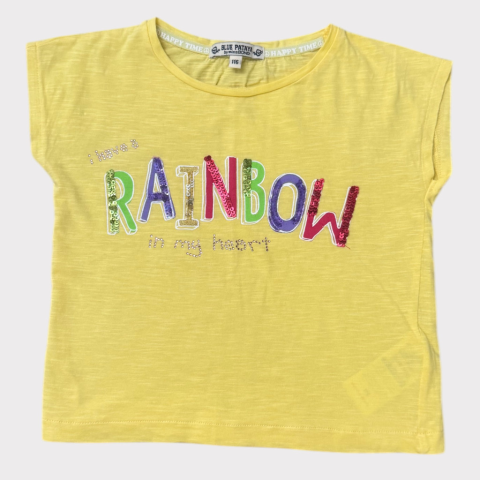 Sárga, flitteres felső Egyenes szabású, kerek nyakkivágású, elején színes flitterekkel. Kellemes pamut anyag. Szép állapotú (az anyag kissé megcsavarodott, felvéve nem látszik)