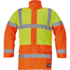 Bélelt és vízhatlan jólláthatósági dzseki az EN 471 szabványnak megfelelő láthatósággal, páraáteresztő PU réteggel, gallérba rejtett kapucnival, az EN 343 szabvány szerinti 3. osztályú vízállósággal és az EN 343 szabvány szerinti 1. osztályú páraátere