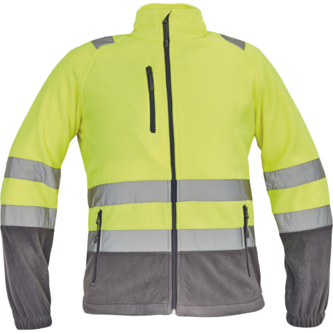 SEVILLA HV polár pulóver sárga/szürk XXL • Hi-Vis férfi polár pulóver 5 cm széles fényvisszavető csíkokkal • cipzáras kivitelben • 1 mellkasi és 2 cipzáras oldalzseb • rugalmas mandzsetták, a pulóver alja húzózsinórral szűkíthető