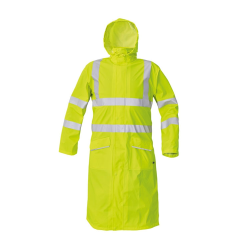 Jól láthatósági esőkabát Alapanyag: Poliuretán réteggel bevont 100 % poliészter A termék megfelel az EN 340, EN 471 szabványoknak. Vízálló, szélálló köpeny gallérba hajtott kapucnival Ergonómikus szabás, rugalmas anyag Hossza 120 cm, bővített szabás, v