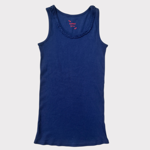 Sötétkék, ujjatlan felső Egyenes szabású, kerek nyakkivágású, anyaga bordázott. Kellemes pamut anyag. Szép állapotú.