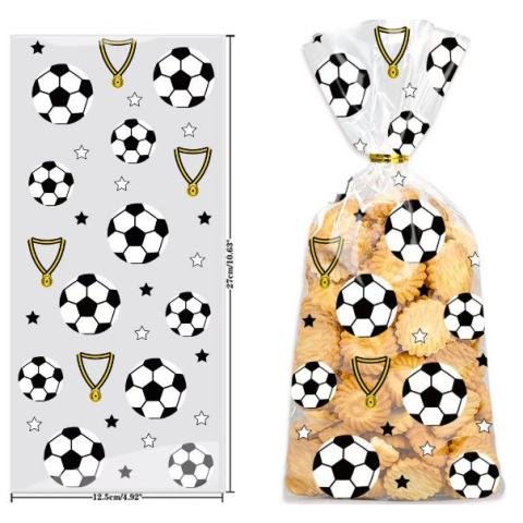 Celofán süteményes zacskó focis mintával, 12 db. Tökéletes focirajongók bulijára és gyerekzsúrokra. ⚽ A focis celofán zacskó ideális választás sportkedvelőknek és gyerekzsúrokra. Mérete 12,5×27 cm, a csomagban 12 db található. Tökéletes aprósütemények,