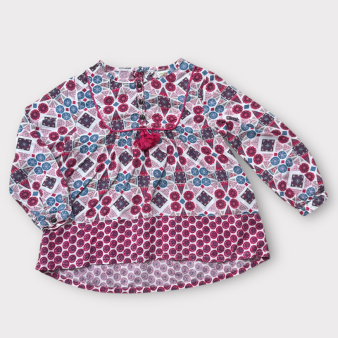 Színes mintás tunika Bővülő szabású, kerek nyakkivágású, nyaknál gombos. Kellemes vékony anyag. Hibátlan állapotú.