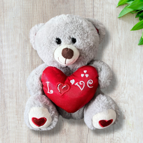 Szürke mackó, szívvel, felakaszható. Méret: 22 cm Szép állapotú (az egyik fülén van egy 1 mm-es lyuk)