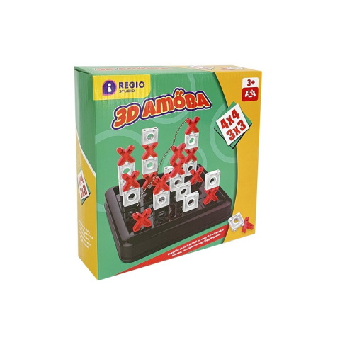 Korosztály: 3 - 14 év Társasjáték - 3D amőbaJátékosok száma: 1-2 játékos,Korosztály: 3 éves kortól ajánlott.Legyél Te az első, aki 4 X-et vagy O-t tud kirakni átlósan, vízszintesen vagy függőlegesen!A játék menete:1. A fiatalabb játékos kezd. Először kiválasztja, melyik formával szeretne lenni (X vagy O), majd a kiválasztott formából lerak egy elemet a táblára.
