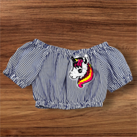 Alja és teteje gumírozott, elején flitteres unikornissal. mell:2x29cm hossz:22cm Nincs benne címke figyeld a mért adatokat. Hibátlan állapotú.