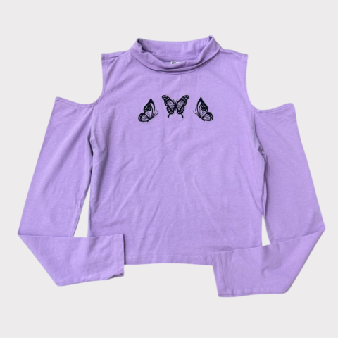 Vállnál kivágott, pillangós felső Egyenes szabású, vállnál kivágott, magasított nyakú. Elején pillangós hímzéssel. Kellemes pamutos (95%) anyag. Szép állapotú.