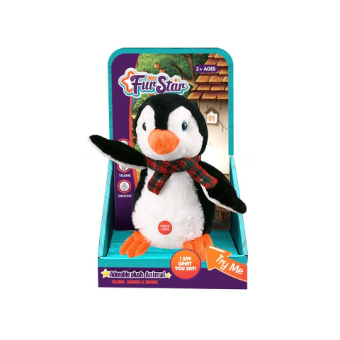 Korosztály: 2 - 6 év Visszabeszélő pingvinInteraktív játék kicsiknek. Tud kedves nyugtató dallamokat is játszani, de képes visszamondani az elhangzottakat.A plüss mérete kb 23 cm. A játék 3 db AAA elemmel működik.