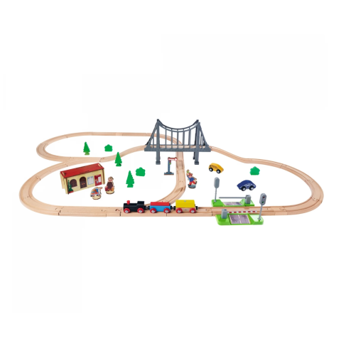55 darabos fa vasút készlet híddal, sorompóval, állomással, 3 részes mozdonnyal, 2 darab kocsival és rengeteg egyéb kiegészítővel. A pálya hossza 500cm.