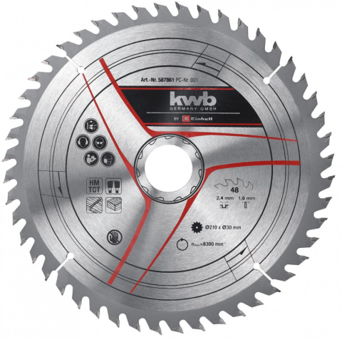 Einhell kwb fűrészlap 210x30x2,8 48 fogas (49587861) Keményfém lapkás körfűrészlap asztali körfűrészekhez és gérvágó fűrészekhez. Méretek: Külső átmérő: 210.0 mm Furat: 30 mm Max. fordulatszám: 8300 ford./perc Törzslap vastagság : 2,8 mm Fogszám: 48