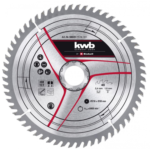 Einhell Kwb Körfűrészlap 216x30x2,4 60 fogas (49588261) Keményfém lapkás körfűrészlap asztali körfűrészekhez és gérvágó fűrészekhez. Méretek: Külső átmérő: 216.0 mm Furat: 30 mm Max. fordulatszám: 8300 ford./perc Törzslap vastagság : 2,4 mm Fogszám: