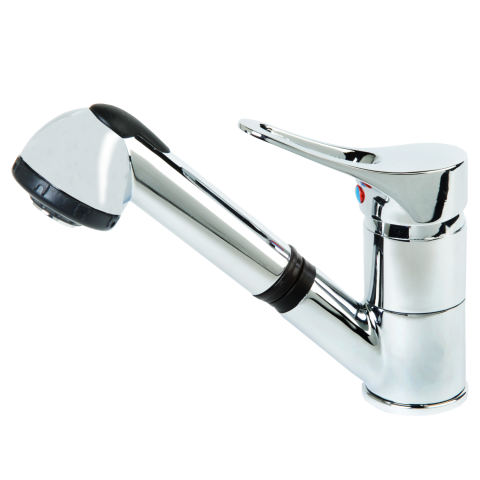 Verona egykaros krómozott mosogató csaptelep, 40 mm-es kerámiabetéttel. Álló kivitel, kihúzható zuhannyal. 2 féle vízsugár funkció.