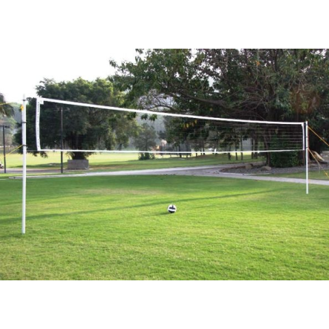 Röplabda állvány szett otthoni használatra: erős fém (alumínium) 3,8 cm-es állvány (földbe rögzíthető) és kültéri röplabda háló (975×91 cm) sodronnyal. Az állvány magassága: 243 cm. A képen látható labda nem a termék része!