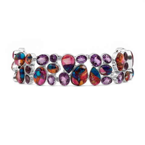 A karlánc szélessége 24 mm, hossza választható 18 vagy 19,5 vagy 21 cm. A középen lévő szabálytalan osztriga türkiz kő mérete ~ 12 x 16 mm, a nagysobb ovális csiszolt ametiszt kövek mérete ~ 8 x 10 mm