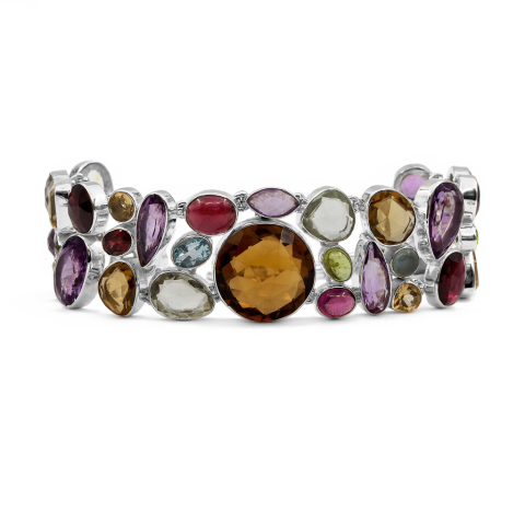 A karlánc szélessége a csiszolt füstkvarc kőnél 26 mm, hossza állítható 19 vagy 20,5 vagy 22 cm. A középen lévő csiszolt füstkvarc kő ~ 19 mm, a csiszolt ovális és csepp alakú ametiszt kövek mérete ~ 10 x 15 mm, a csepp alakú zöld ametiszt kő mérete ~ 12