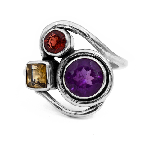 A gyűrű feje 19 x 21 mm. A sín szélessége hátul 2 mm. A csiszolt ametiszt kő ~ 8 mm átmérőjű, a csiszolt gránát kő mérete ~ 5 x 5 mm, a csiszolt olivin kő ~ 5 mm átmérőjű.