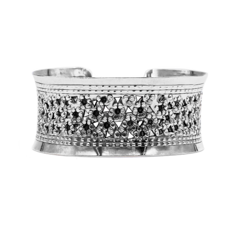 A merev karkötő homorú és 29 mm széles. Áttört, kis virág mintás. A karkötő belső kerülete (a képeken) 18 cm, állítható.