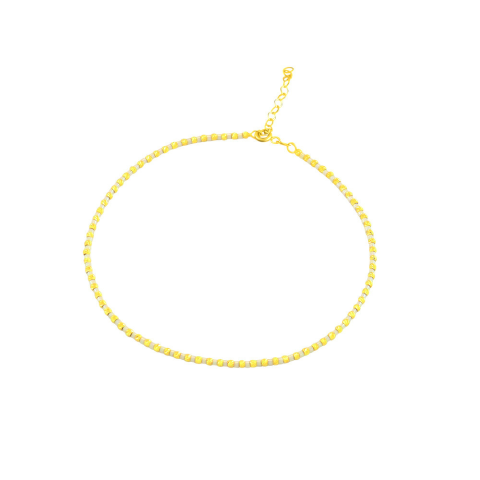 Visszafogottan elegáns arany bokalánc fehér kerámia díszítéssel – tökéletes harmónia a hagyományos és modern stílus között. A 14 karátos arany meleg csillogását gyönyörűen kiegészíti a fehér kerámia tiszta, fényes felülete. Ez a kéttónusú párosítás letisz
