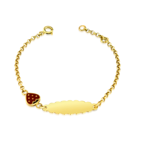14 karátos aranyból készült karlánc gyermekek részére eper motívummal. Tartalmaz egy kb. 7 mm x 25 mm -es felületet, melyre akár gyermekünk nevét gravírozhatjuk. Súlya kb.: 2,3 g. Hossza kb. 15 cm.