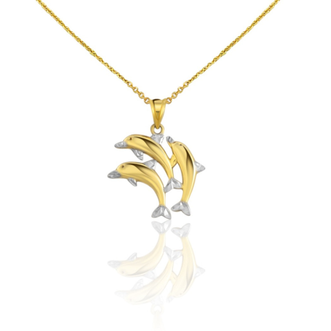 14 karátos aranyból készült három delfint ábrázoló medál. A delfinek orra, uszonya és farka fehérarany, így a medál igazán egyedi viselet. Súlya kb.: 1,50 g. Magassága függő nélkül kb.: 20 mm Legnagyobb szélessége kb.: 20 mm A képen látható lánc nem