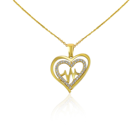 14 karátos aranyból készült szív medál, belső részén kristállyal kirakott szívvel, EKG jellel. Súlya kb.: 1,5 g. Magassága függő nélkül kb.: 20 mm Legnagyobb szélessége kb.: 19 mm A képen látható lánc nem képezi a termék részét, az külön megvásárolhat