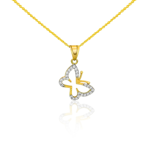 14 karátos aranyból készült pillangót ábrázoló medál, kristály díszítéssel. Ez a 14 karátos aranyból készült, pillangót ábrázoló medál igazi mestermunka, amely az elegancia és a természet szépségének tökéletes egyensúlyát tükrözi. A finoman kidolgozott
