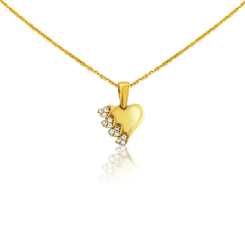 14 karátos aranyból készült szívet ábrázoló medál, az egyik oldalán kristályokkal díszítve. Súlya kb.: 0,8 g. Magassága függő nélkül kb.: 10 mm Legnagyobb szélessége kb.: 10 mm A képen látható lánc nem képezi a termék részét, az külön megvásárolható:
