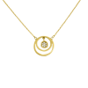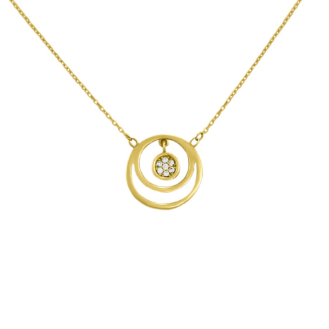 Ez a lenyűgöző 14 karátos arany nyaklánc tökéletes kiegészítője lehet bármely nő ékszergyűjteményének. A nyaklánc középpontjában két, excentrikus karika medál található, melyek közepén egy csillogó kristály ragyog. Ez az elegáns darab egyaránt kitűnően mu