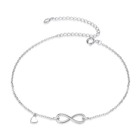 Ezüstből készült bokalánc a végtelen jelével és egy apró szívvel díszítve. Hossza 19-25 cm, súlya 1.5 g. A termék anyaga: 925 sterling ezüst, amit a magyar szabályoknak megfelelően: 2g feletti termék esetén a termékbe ütött vagy gravírozott névjel és/vagy