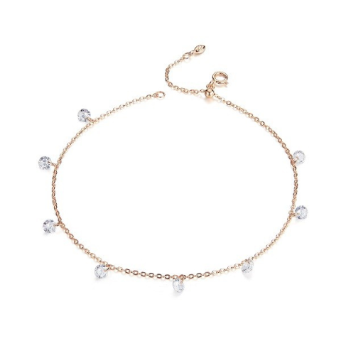 Ezüstből készült bokalánc cirkóniumkristály gyöngyökkel díszítve, rosegold bevonattal. Hossza 23 cm, súlya 1.6 g. A termék anyaga: 925 sterling ezüst, amit a magyar szabályoknak megfelelően: 2g feletti termék esetén a termékbe ütött vagy gravírozott névje