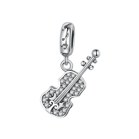 Fedezd fel az elegancia és zene harmóniáját ezzel a gyönyörű ezüst hegedű charmmal, amely bármely karkötő vagy nyaklánc tökéletes kiegészítője lehet. A 925 sterling ezüstből készült charm finom kidolgozottsága és a fehér cirkóniumkristályok ragyogása külö