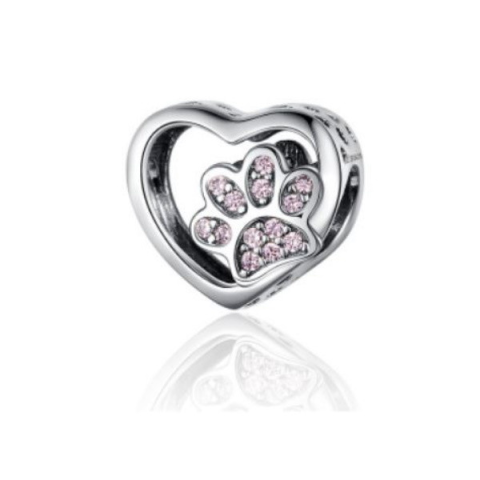Ez a bájos, szív alakú charm a tökéletes választás mindazoknak, akik szeretik a kutyákat és az elegáns ékszereket. A 925 sterling ezüstből készült charm közepén egy rózsaszín cirkóniumkristállyal díszített kutyamancs motívum található, amely finom csillog