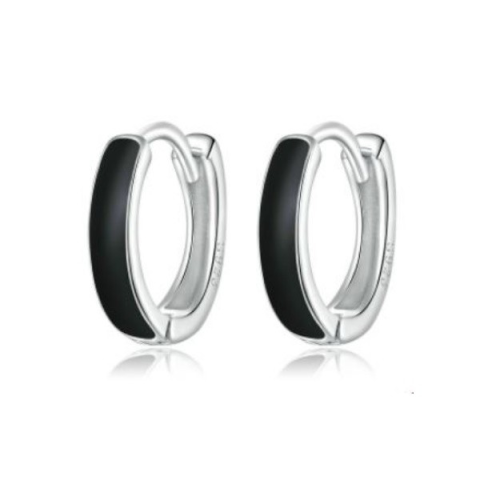 Ezüstből készült, fekete zománccal díszített női karikafülbevaló. Mérete 1.2 × 0.3 cm, súlya 1.3 g. A termék anyaga: 925 sterling ezüst, amit a magyar szabályoknak megfelelően: 2g feletti termék esetén a termékbe ütött vagy gravírozott névjel és/vagy fémj