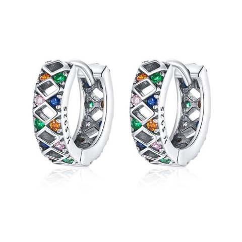 Ezüstből készült, színes cirkóniumkristállyal és rombuszmintával díszített női fülbevaló. Mérete 1.3 × 0.38 cm, súlya kb. 2.3 g. A termék anyaga: 925 sterling ezüst, amit a magyar szabályoknak megfelelően: 2g feletti termék esetén a termékbe ütött vagy gr