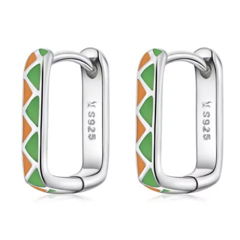 Ezüstből készült, színes zománcozással díszített szögletes fülbevaló. Mérete 1.3 × 0.2 cm, súlya 1.7 g. A termék anyaga: 925 sterling ezüst, amit a magyar szabályoknak megfelelően: 2g feletti termék esetén a termékbe ütött vagy gravírozott névjel és/vagy