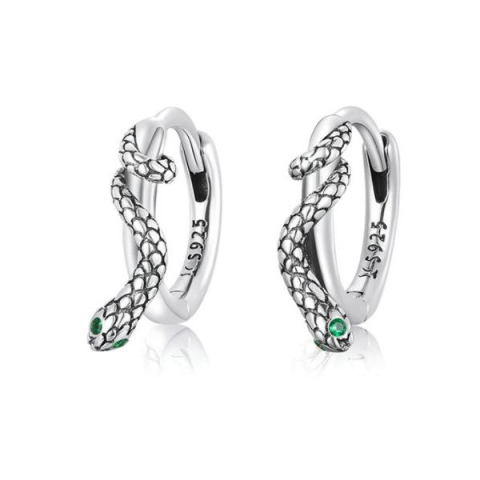 Ezüstből készült női karikafülbevaló, zöld cirkóniumkristállyal díszített kígyóval. Mérete 1.2 × 0.4 cm, súlya 1.6 g. A termék anyaga: 925 sterling ezüst, amit a magyar szabályoknak megfelelően: 2g feletti termék esetén a termékbe ütött vagy gravírozott n