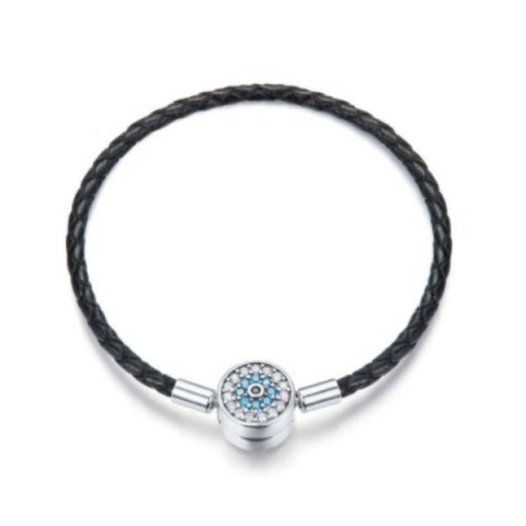 Ezüstből és műbőrből készült karperec kék és fehér cirkóniumkristállyal díszítve. Hossza 19 cm, a zárókapocs mérete 1.1 × 1.1 cm. A termék anyaga: 925 sterling ezüst, amit a magyar szabályoknak megfelelően: 2g feletti termék esetén a termékbe ütött vagy