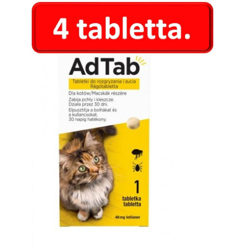 1. AZ ÁLLATGYÓGYÁSZATI KÉSZÍTMÉNY NEVE AdTab 12 mg rágótabletta macskák részére (0,5–2,0 kg) AdTab 48 mg rágótabletta macskák részére (> 2,0–8,0 kg) 2. MINŐSÉGI ÉS MENNYISÉGI ÖSSZETÉTEL Hatóanyag: Minden rágótabletta az alábbiakat tartalmazza: