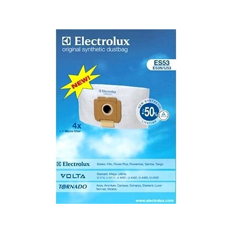 Porzsák Electrolux - textil, egyszer használatos, szűrő a csomag része, 4 porzsák a csomagban Eredeti Electrolux ES53 porzsák. Az ES53 porzsák kíváló szívóteljesítményt biztosít a porszívójának a porzsák teljes élettartama alatt. Hála a kiváló többrétegű szűrőrendszernek még a legfin