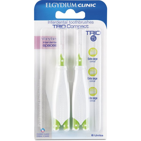 Fogköztisztító kefe - kompakt, ISO méret 7 (2,4 mm felett), alkalmas 2,5 mm felett méretű fogközökhöz, drót átmérője 1,5 mm felett, hagyományos szálak, zöld kivitel, 6 darabos csomag Az ELGYDIUM CLINIC Trio Compact 5 fogköztisztító kefék innovatív megoldást kínálnak három különböző méretű kefe (8-7 mm) kombinációjával egy tartón, ami megkönnyíti használatukat és lehetővé teszi a k