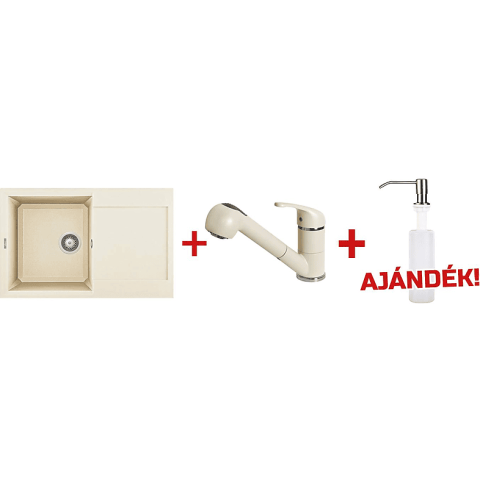 Elleci Easy 300 G62 Bianco Antico mosogatótálca 1 medencés mosogatótálca csepegtetővel, munkalapra szerelhető, anyaga: granitek, színe: G62 bianco antico, mosogatótálca mérete: 790x500 mm, medence mélysége: 220 mm, tartozékok: helytakarékos szifon, szűrőkosár, rögzítő fülek, elleci túlfolyó, 10 év garancia Elleci Venere G62 csaptelep Egykaros csaptelep forgatható kifolyócsővel, kerámiabetéttel, kihúzható zuhanyfejjel és kétféle vízsugárral (zuhany / normál).