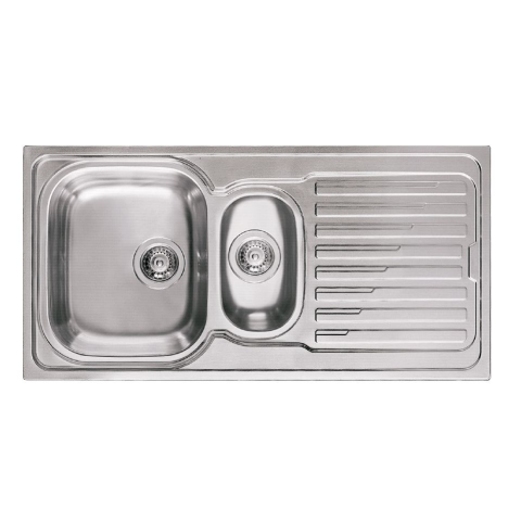Munkalapra szerelhető 18/10 rozsdamentes anyagból készült inox mosogatótálca, csaptelep számára előfúrt lyukkal, szűrőkosár, helytakarékos szifon, lefogató körmök és tömítőszalag.