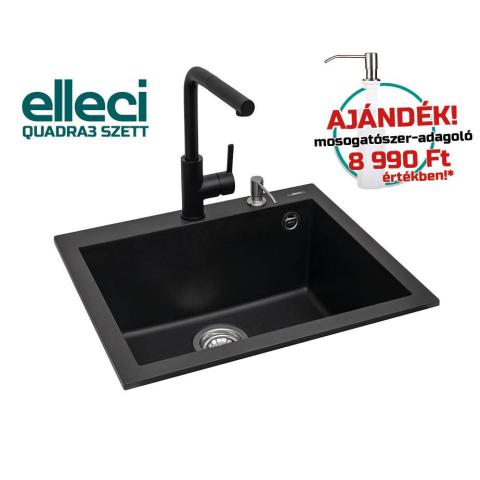 ELLECI - QUADRA3 szett Elleci akciós szett ajánlat: mosogatótálca+csaptelep+mosogatószer-adagoló A SZETT TARTALMA Elleci Quadra 105 G40 mosogatótálca 1 medencés mosogatótálca, munkalapra szerelhető, anyaga: granitek, színe: G40 nero, mosogatótálca m
