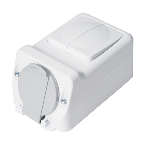 IP44-es védelemmel rendelkező szürke csapfedeles dugalj + csillárkapcsoló. Feszültség: 230V Max áramerősség: 16A Védelem: IP44 Szerelési mód: falon kívül Szín: fehér