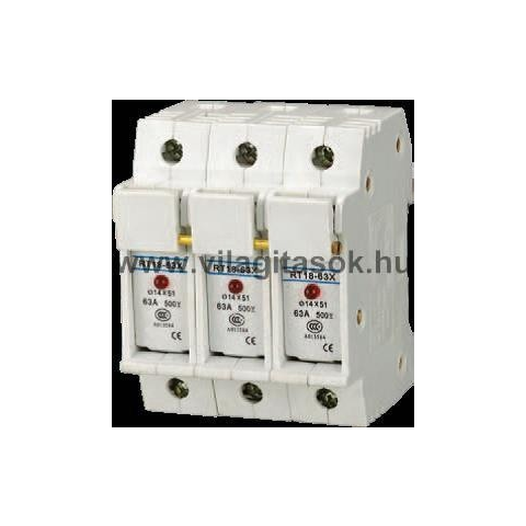 AC,DC rövidzárlat védelem. DIN sinre szerelhető 51x14mm (40-63A)-es hengeres biztosítókhoz. LED-es kijelzővel van szerelve, az előlapon mutatja a biztosító betét állapotát. Alkalmas egyenáramú rendszerre. Műszaki adatok: * Névleges feszültség: 500V * Max