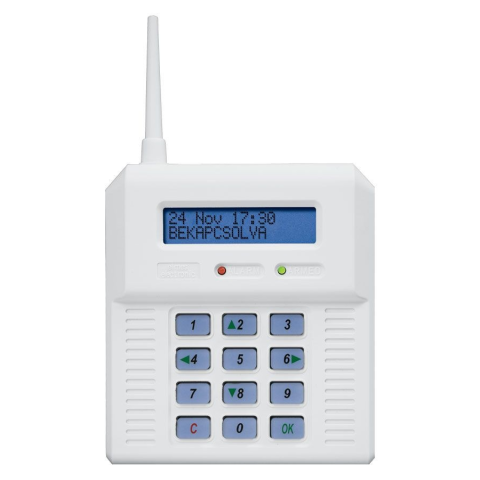 1 kép ELMES CB32-GN vezeték nélküli, 32 zónás központ, beépített GSM-mel. Kék háttérfény.
