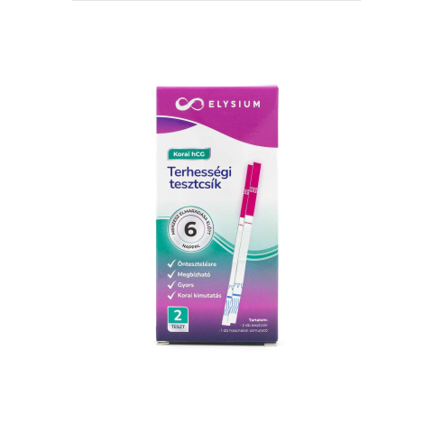 Elysium HCG korai kimutatású terhességi tesztcsík, mely a terhesség korai felismerésének elősegítésére szolgál, akár 6 nappal az elmaradó menzesz előtt. A doboz 2 db öntesztelésre készült, magas érzékenységű tesztcsíkot tartalmaz.