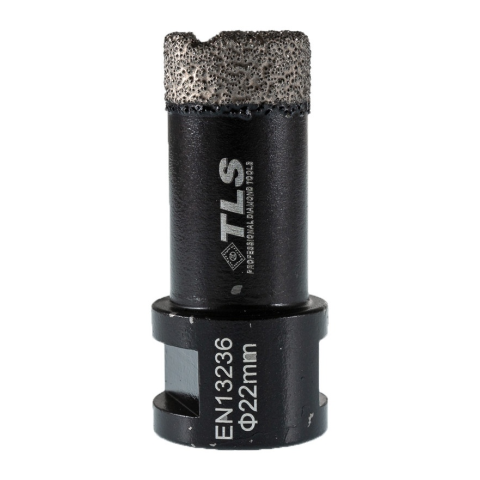 TLS COBRA gyémántszemcsés lyukfúró Átmérő: d=22 mm (M14 menetes csatlakozás) Alkalmazás: száraz és vizes Alkalmazási terület: Gres, kőporcelán, kemény kerámiák, gránit, márvány, természetes kövek, tégla, beton, szikla, egyéb építőipari anyagok TLS CO
