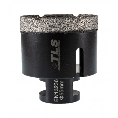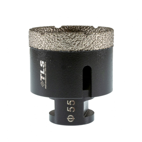 TLS COBRA gyémántszemcsés lyukfúró Átmérő: d=55 mm (M14 menetes csatlakozás) Alkalmazás: száraz és vizes Alkalmazási terület: Gres, kőporcelán, kemény kerámiák, gránit, márvány, természetes kövek, tégla, beton, szikla, egyéb építőipari anyagok TLS CO