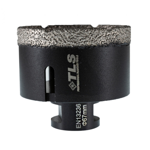 TLS COBRA gyémántszemcsés lyukfúró Átmérő: d=67 mm (M14 menetes csatlakozás) Alkalmazás: száraz és vizes Alkalmazási terület: Gres, kőporcelán, kemény kerámiák, gránit, márvány, természetes kövek, tégla, beton, szikla, egyéb építőipari anyagok TLS CO
